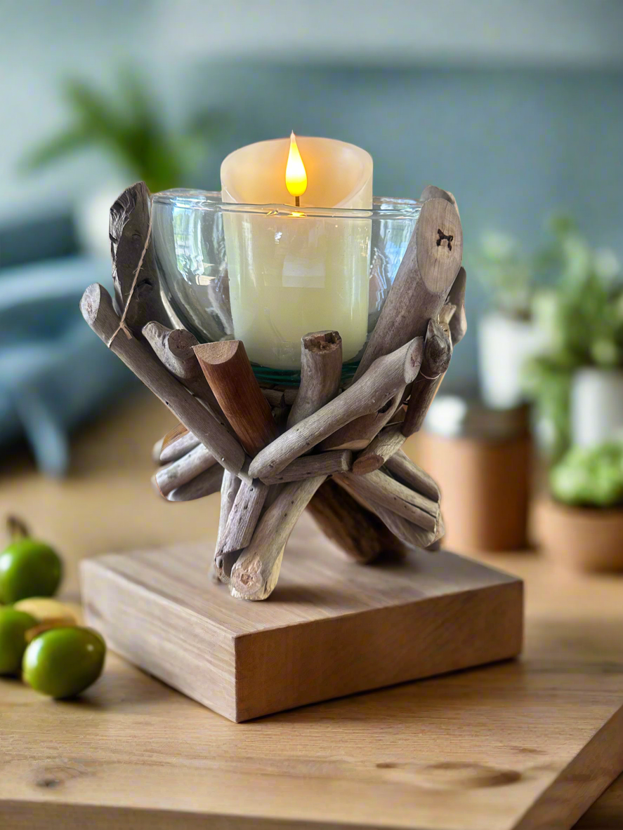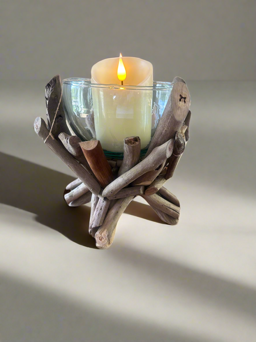 This unique candleholder features a harmonious blend of weathered driftwood and clear glass, creating a striking balance between organic texture and smooth elegance. Carefully selected pieces of driftwood—each with its own naturally aged character—form the base or frame, supporting a glass vessel designed to hold a tea light, votive, or pillar candle. The result is a warm, earthy centerpiece that casts a soft, flickering glow, making it perfect for coastal-themed décor, rustic interiors, or outdoor entertaining space.