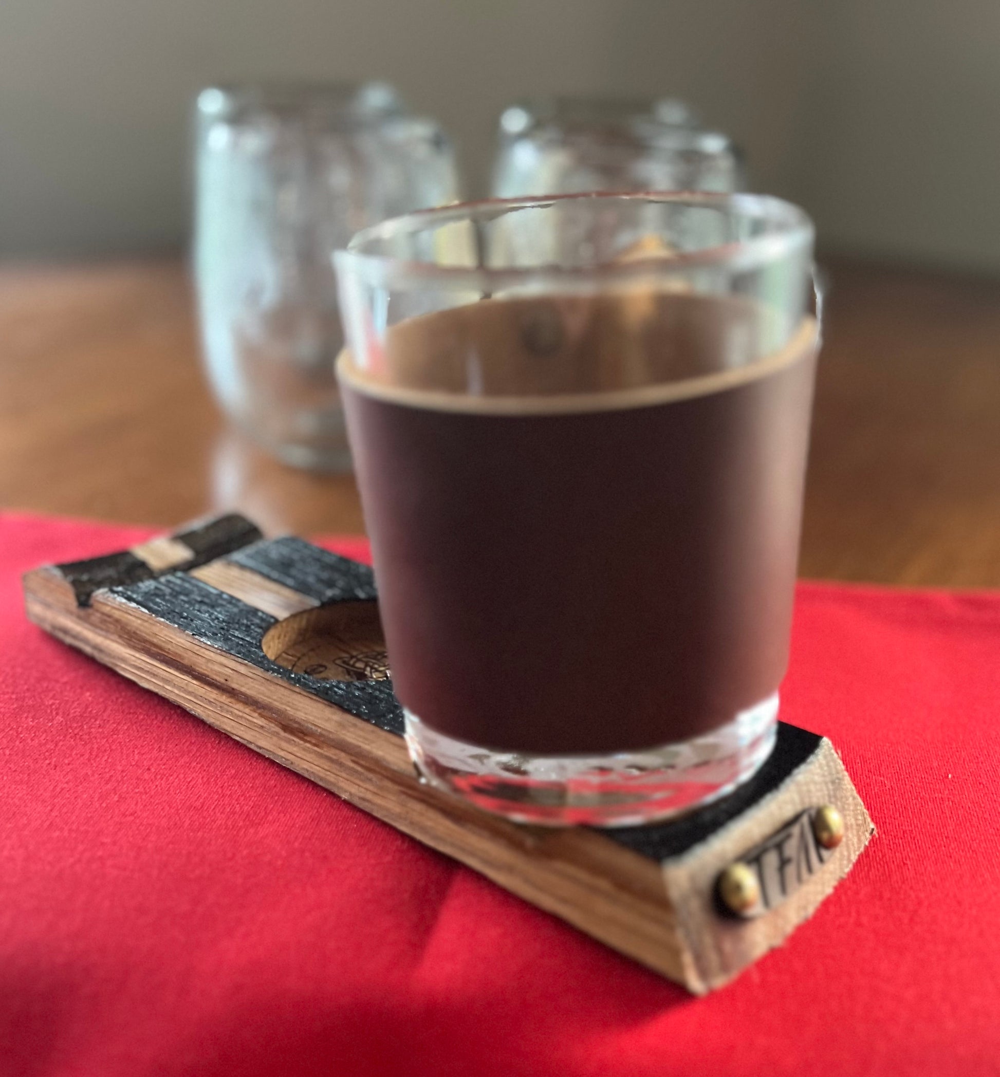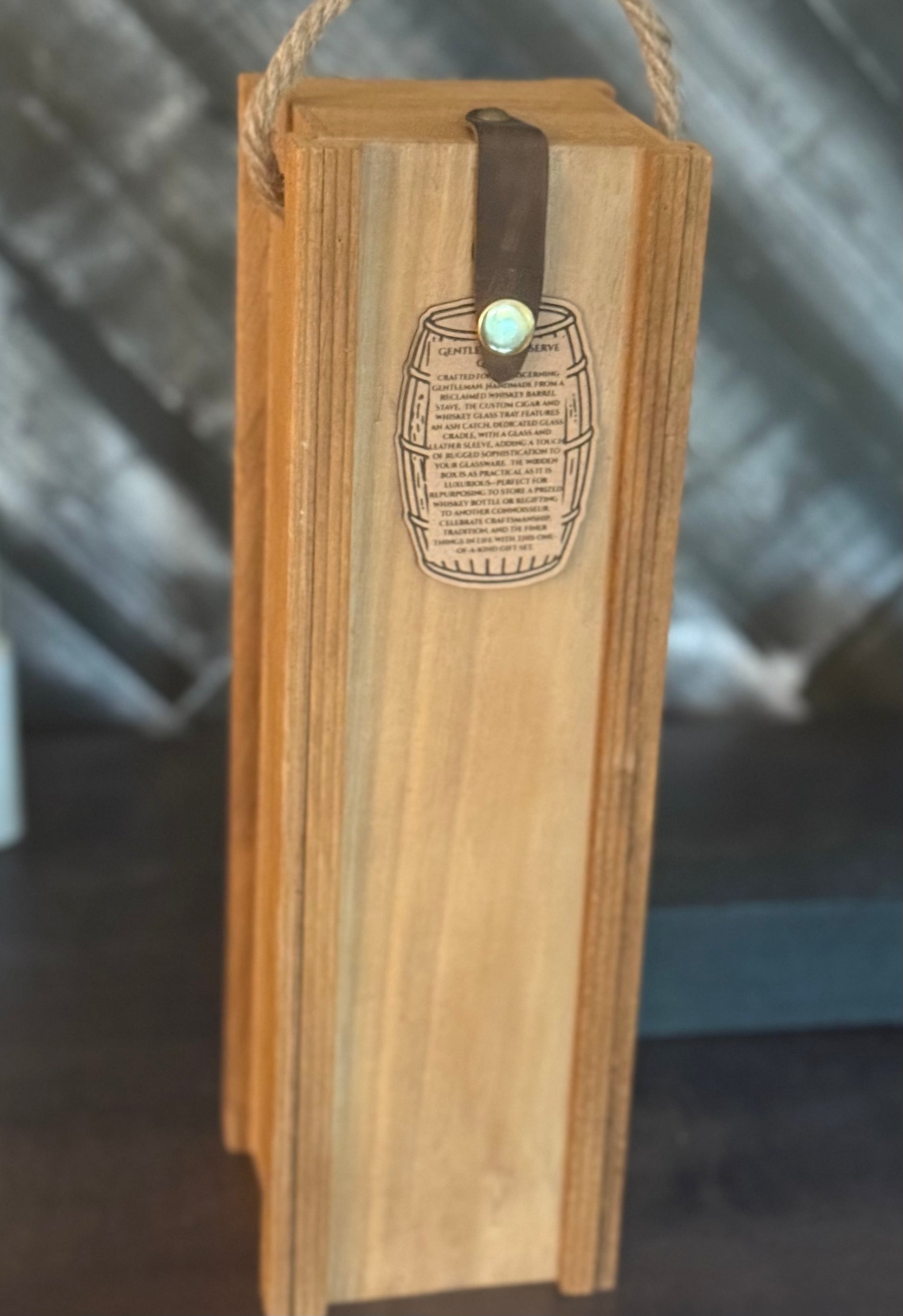 Crafted for the discerning gentlemen, includes a whiskey glass tray and cigar rest, hand-made from a reclaimed whiskey barrel stave. The cigar rest features an ash catch, and the whiskey glass is wrapped in a leather sleeve adding a touch of warmth and sophistication to your glassware. The wooden box is as practical as it is luxurious-perfect for repurposing to store a prized whiskey bottle or regifting to another connoisseur. Celebrate craftsmanship, tradition, and the finer things in life with this one-of-a-kind gift set.