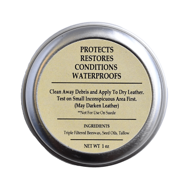 Our all natural leather balm will protect, restore and waterproof your leather goods to ensure they last a lifetime and look good the entire time. The balm can be used on any real leather products such as boots, belts, wallets and more. Clean away debris and apply it to dry leather but first, test it on a small inconspicuous area (may darken leather). Not for use on suede or fake leather.