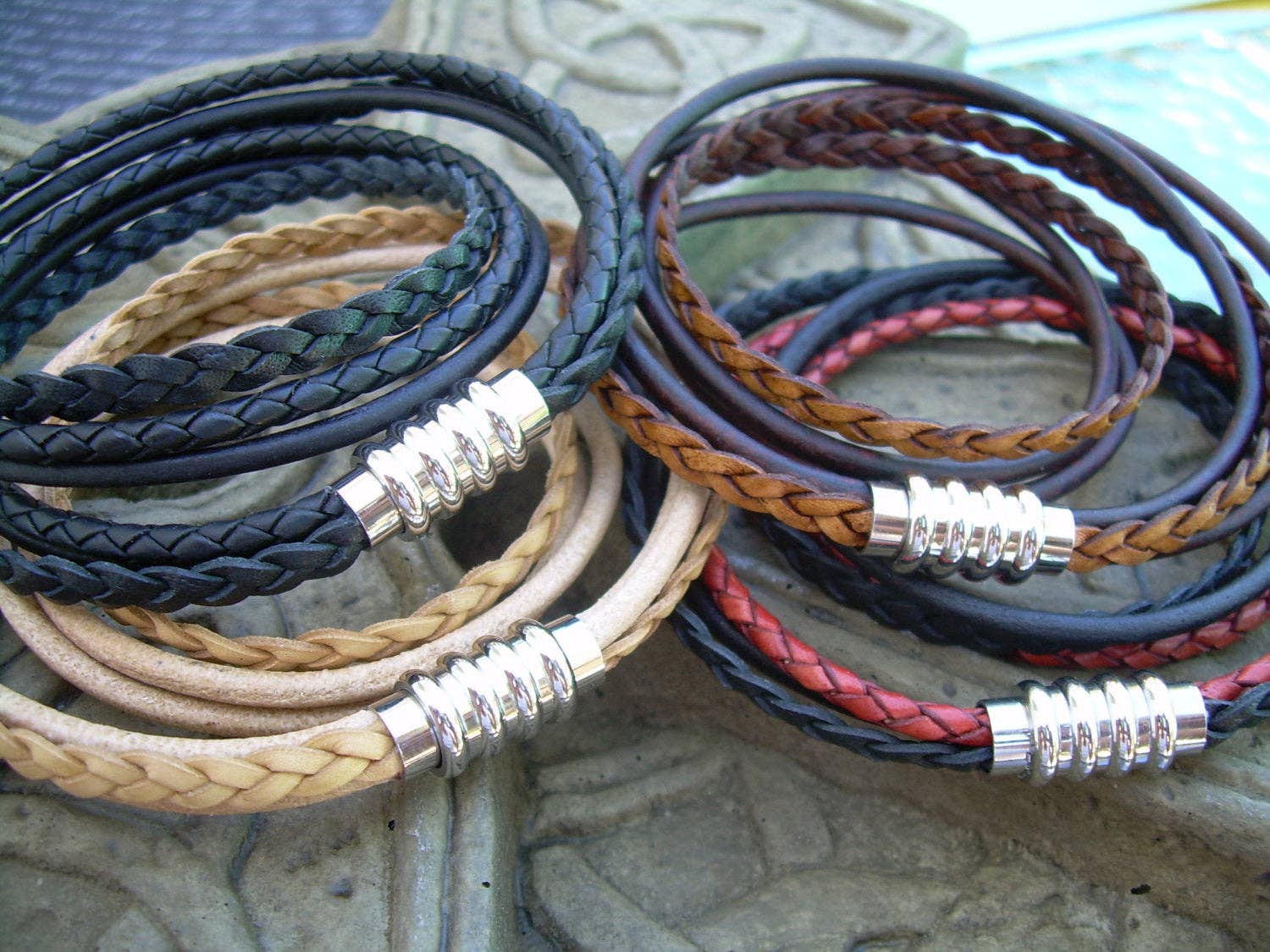 This double wrap/ triple strand leather bracelet style features Fine Imported Quality Leather - double strands of 3mm round and or braided and one strand of 5mm flat braided. A secure stainless steel magnetic clasp (21 mm or 0.82 inch long) serves as a focal point and provides for an easy on and off. Choose from the four available colors of natural, black, brown, black. All dyes used in our leather are certified 100% Lead-Free and meet all requirements of the German Goods Ordinance, REACH (European Union), RoSH (U.K.), and CPSIA (U.S.) which require consumer goods to be free of Lead, AZO‰۪s and carcinogenic chemicals. Each piece comes with a black drawstring pouch. Size: Available to fit a firm wrist measurement of 7/7.5/8 inches.