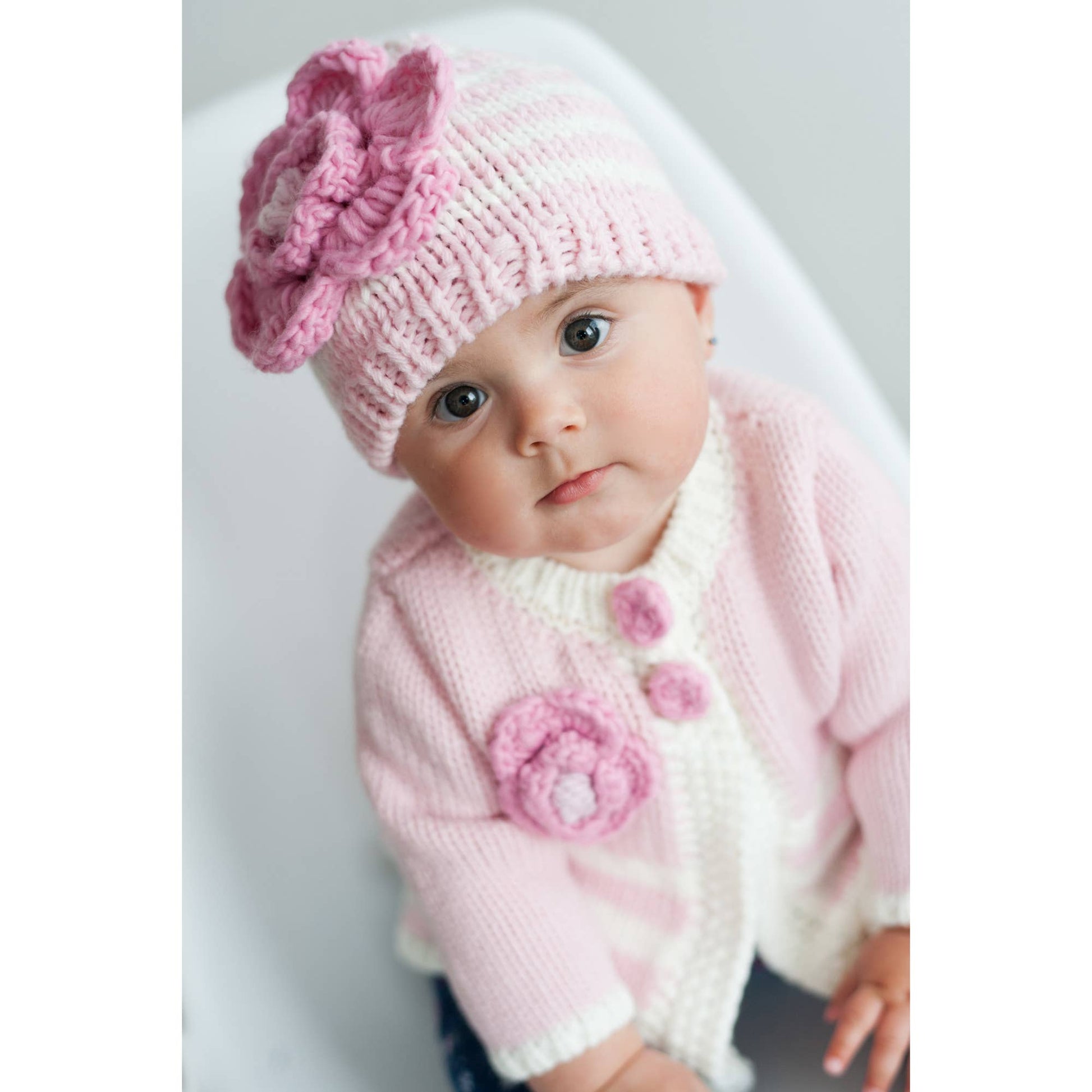 Feminine, cozy sweater for babies in light pink and cream has a pretty medium pink flower accent on the bodice. Swing style fastens with two yarn buttons. Hat is available separately. 100% Icelandic acrylic. Matching hat is available separately.