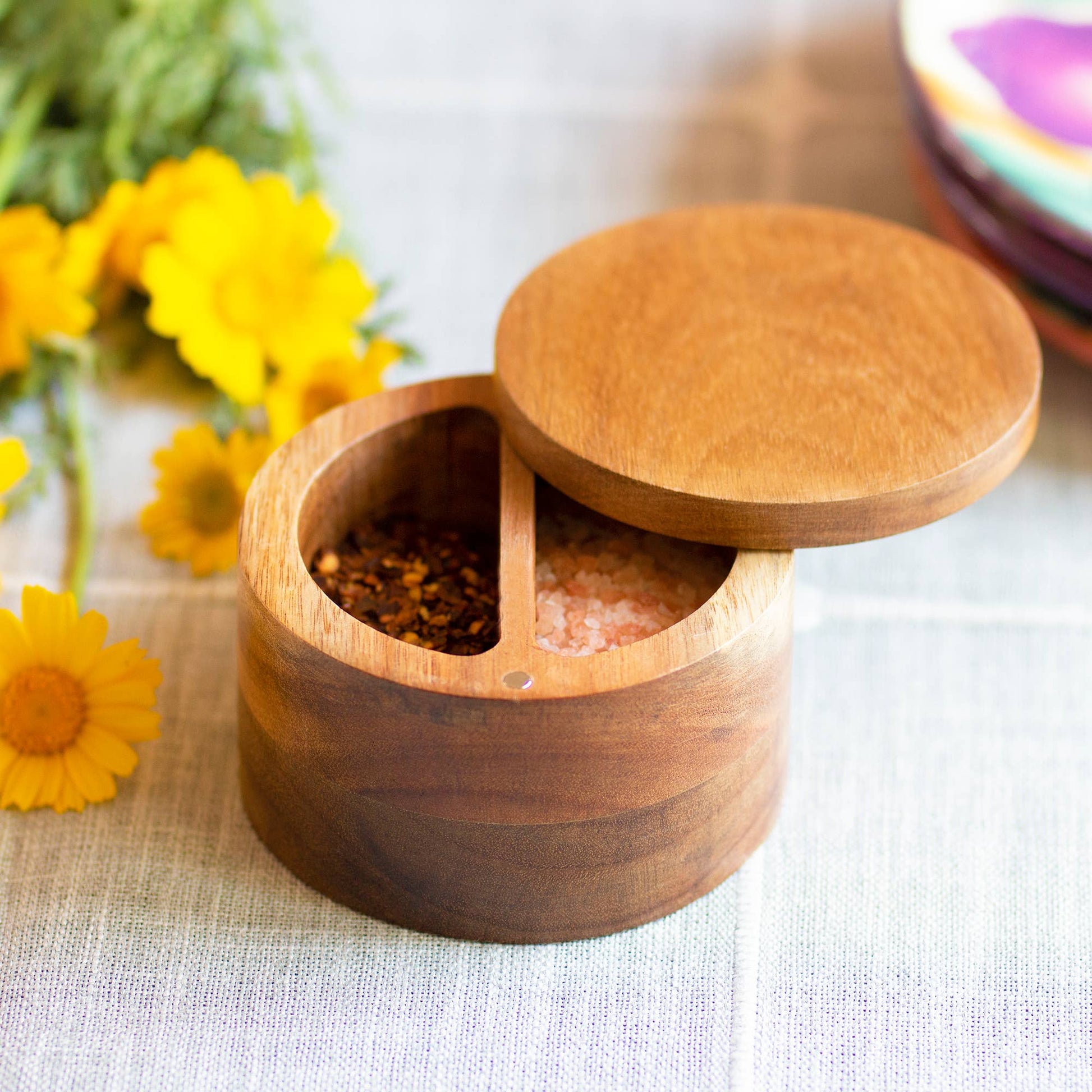 The Rock & Branch® Acacia Duet Salt Cellar offers the convenience of the popular salt boxes with twice the seasonings! Whether it's used for salt and pepper or any other flavor combination, your shoppers will appreciate its utility. The beautiful acacia construction looks great on the countertop, the grill or the dining table.
