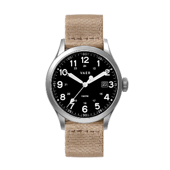 The S5 comes with interchangeable quick-release black silicone and khaki nylon straps, enhancing its adaptability from casual to formal settings. While assembled in Asia to maintain an accessible price point, it undergoes rigorous quality control for uncompromised reliability. For USA-assembled options, explore our C5 Collection. The S5 delivers exceptional value without sacrificing Vaer’s signature durability and aesthetic.