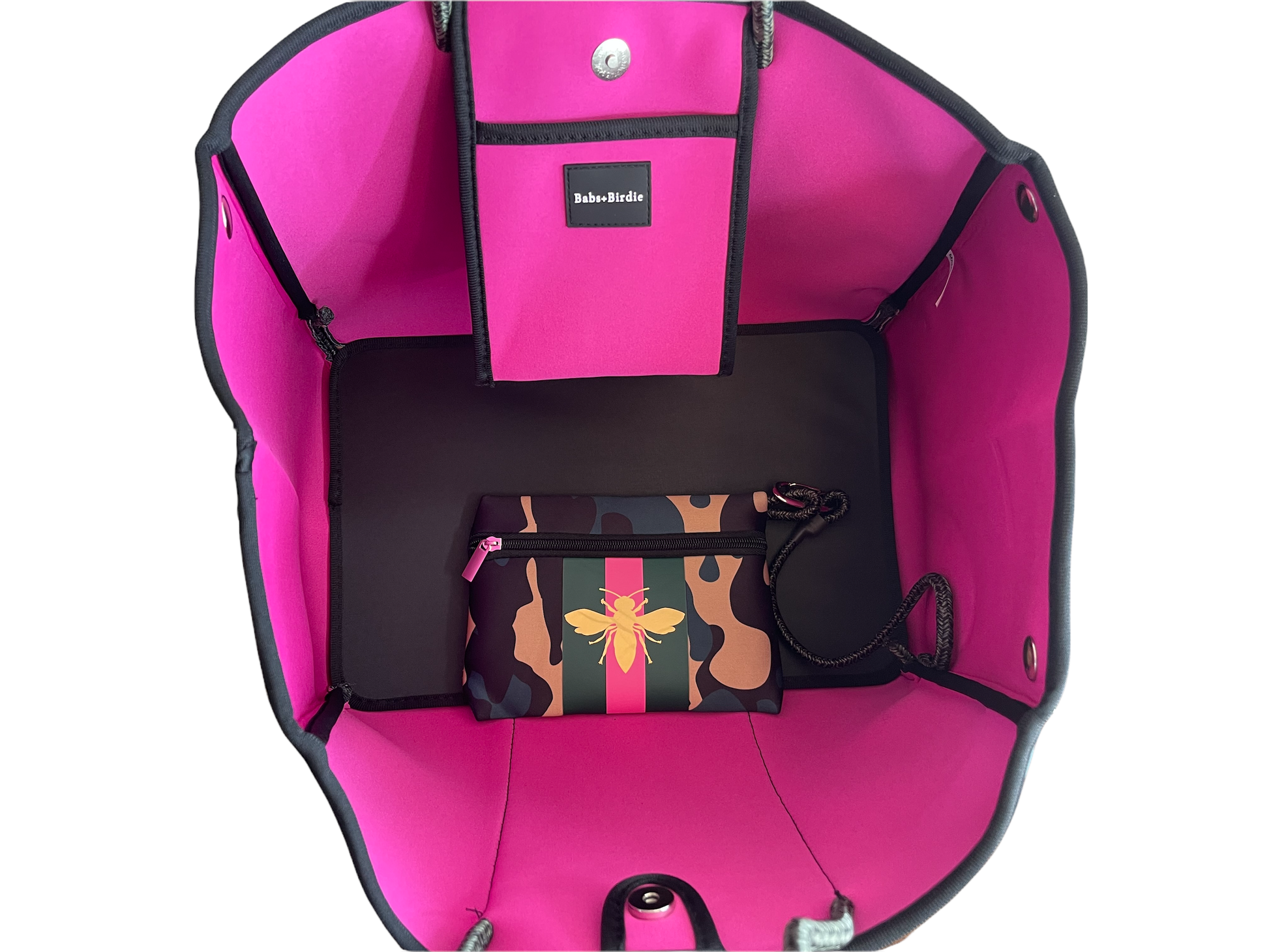 The Aniella Neoprene Tote - Camo with Gold Bee